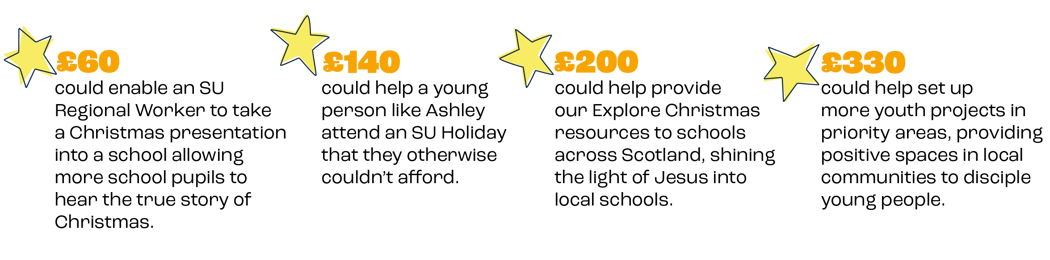 This Christmas, please join us in lighting up Scotland one young life at a time. We simply can’t do it without your help. From SU Holidays to taking the real Christmas story into schools, you can help us bring the good news of Jesus to children and young people across Scotland. You can help young people see that even in their darkest moments, they are not alone. There is a light that shines in the darkness - and the darkness cannot overcome it.